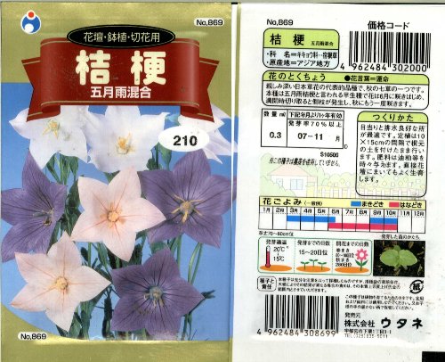 春蒔き3?6月・秋蒔き8?10月秋の七草のひとつで、毎年花を咲かせる宿根草です大輪ききょう【種】 価格: 150円 レビュー評価: 0.0 レビュー数:0 ●秋の七草に数えられる桔梗。 凛とした姿とハッキリとした色が秋空に映えます。 風船のようなつぼみの姿もかわいくて人気です。 実は野草としては消えつつある桔梗、 種から大事に育ててみませんか?●花の色は青紫・白色の混合です。●草丈は40?70cmです。●発芽適温は15?20℃●土かけの厚さは約5mm位です。[育て方]本葉8?10枚の頃、日当たりと水はけの良い場所に植えます。直根性で移植を嫌うので、ポットから抜いたらそのまま植えてください。株間は20cm位が適当です。プランターなら大型のものを使用します。土は石灰・多めの腐葉土・少量の有機質肥料を施し、良く耕しておきます。☆花言葉:変わらぬ愛【トー Supported by 楽天ウェブサービス |